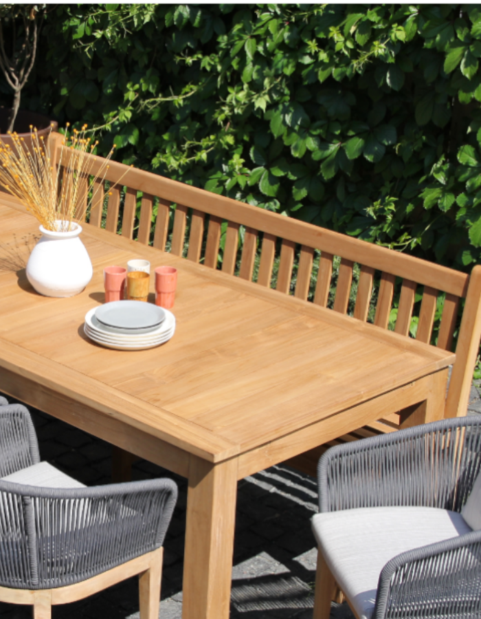 220 cm’den 340 cm’e kadar açılabilen masası, teak ve ip örgü işçiliği ile üretilmiş estetik sandalyeleri ve bench i ile doğallığa ve modern tasarıma yaşam alanlarınızda yer açın.