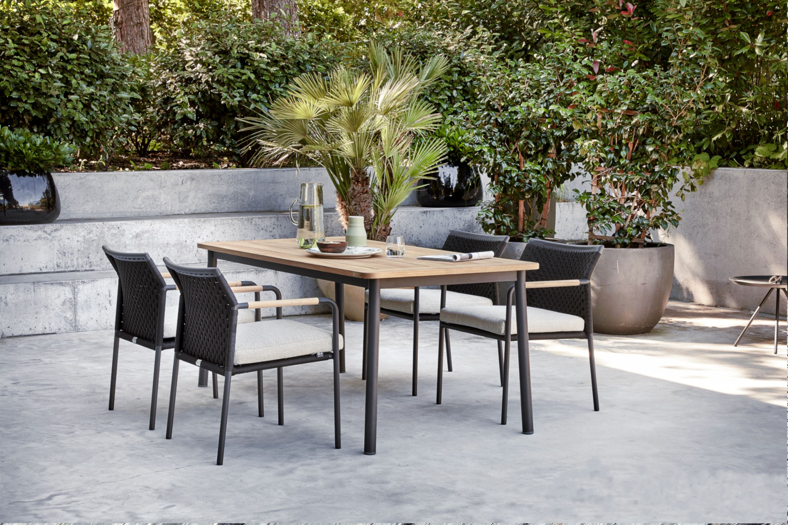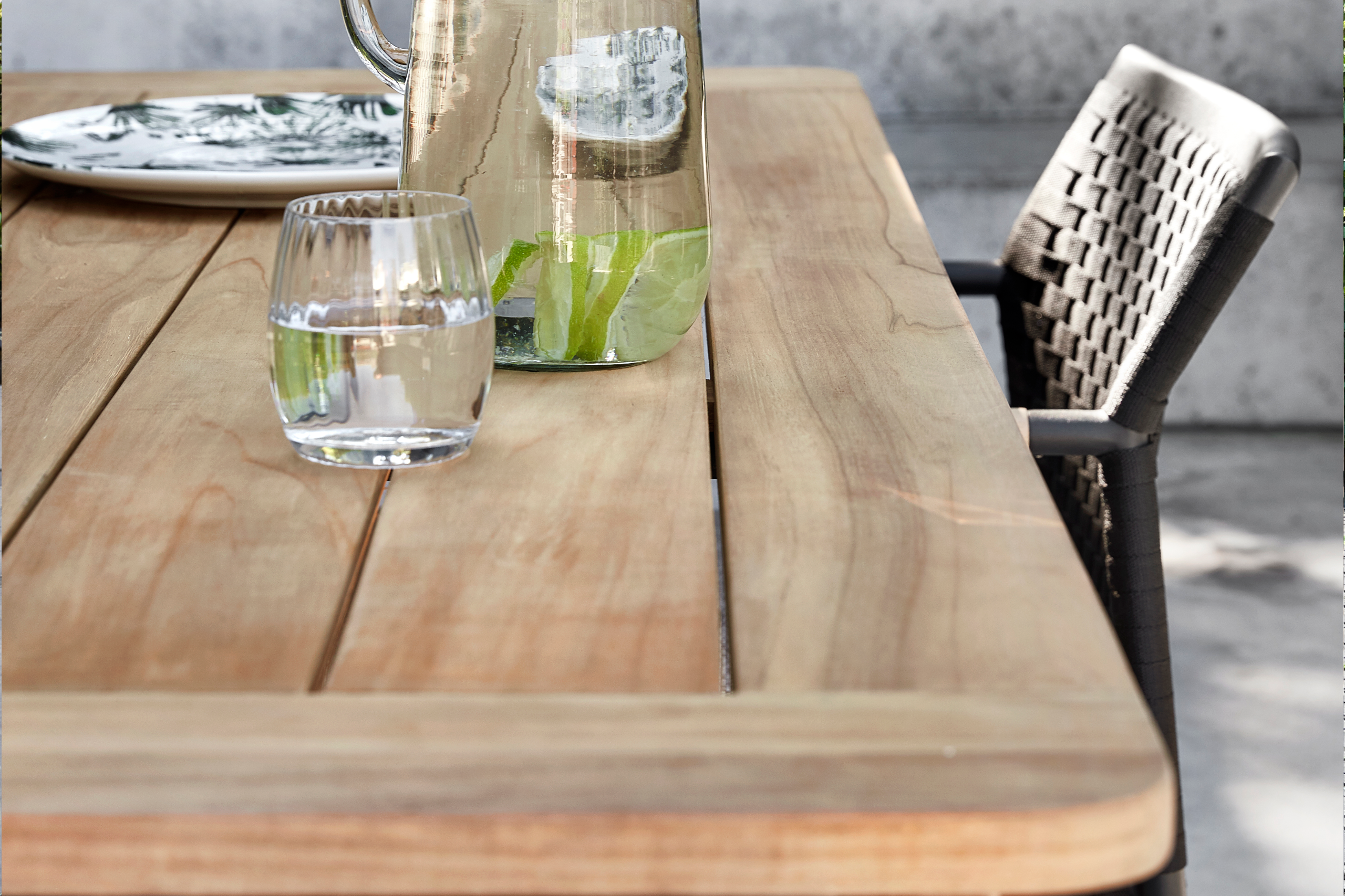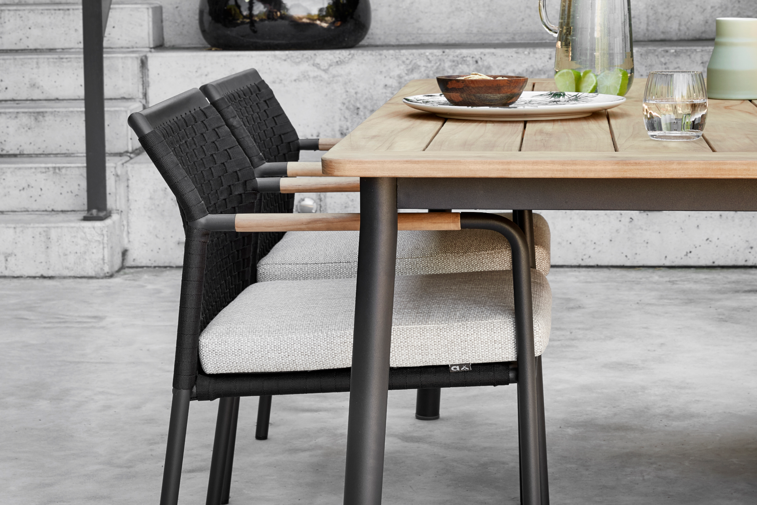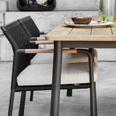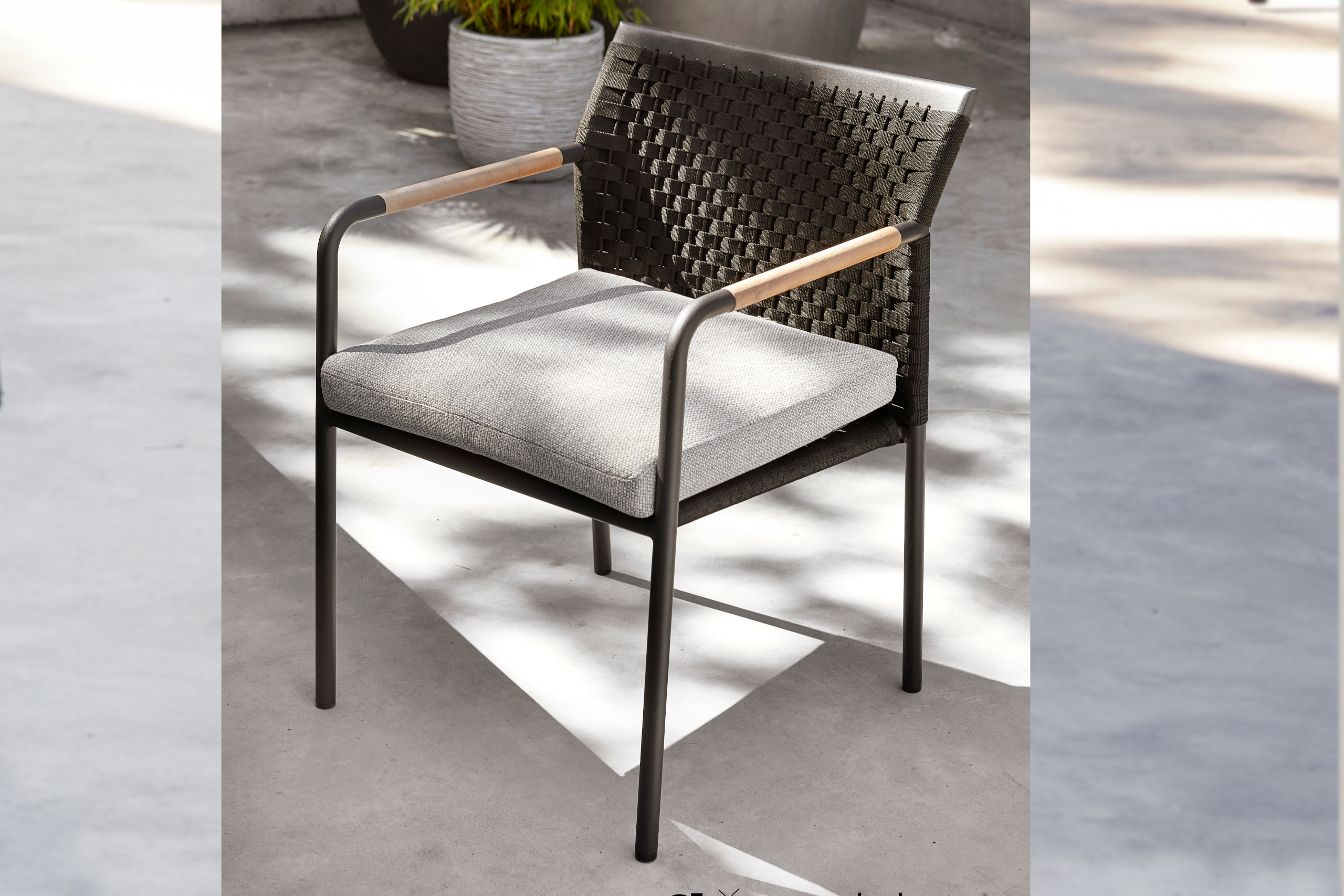 Natural teak ağacı ve alüminyumun belt örgü işçiliği ile mükemmel uyumu. Modern ve estetik tasarım.