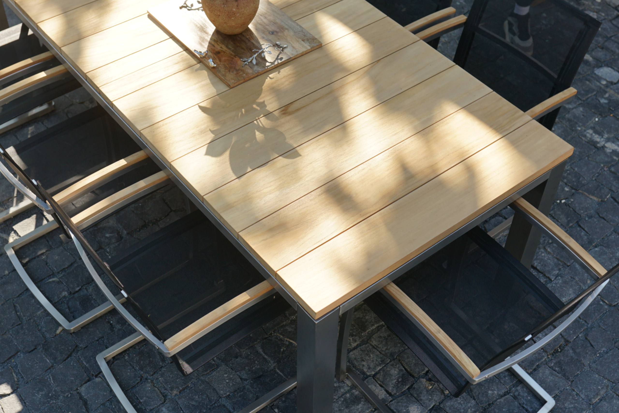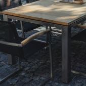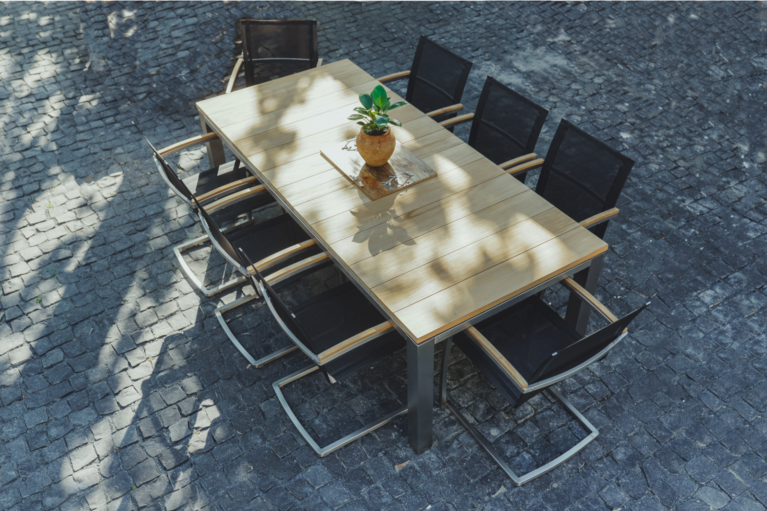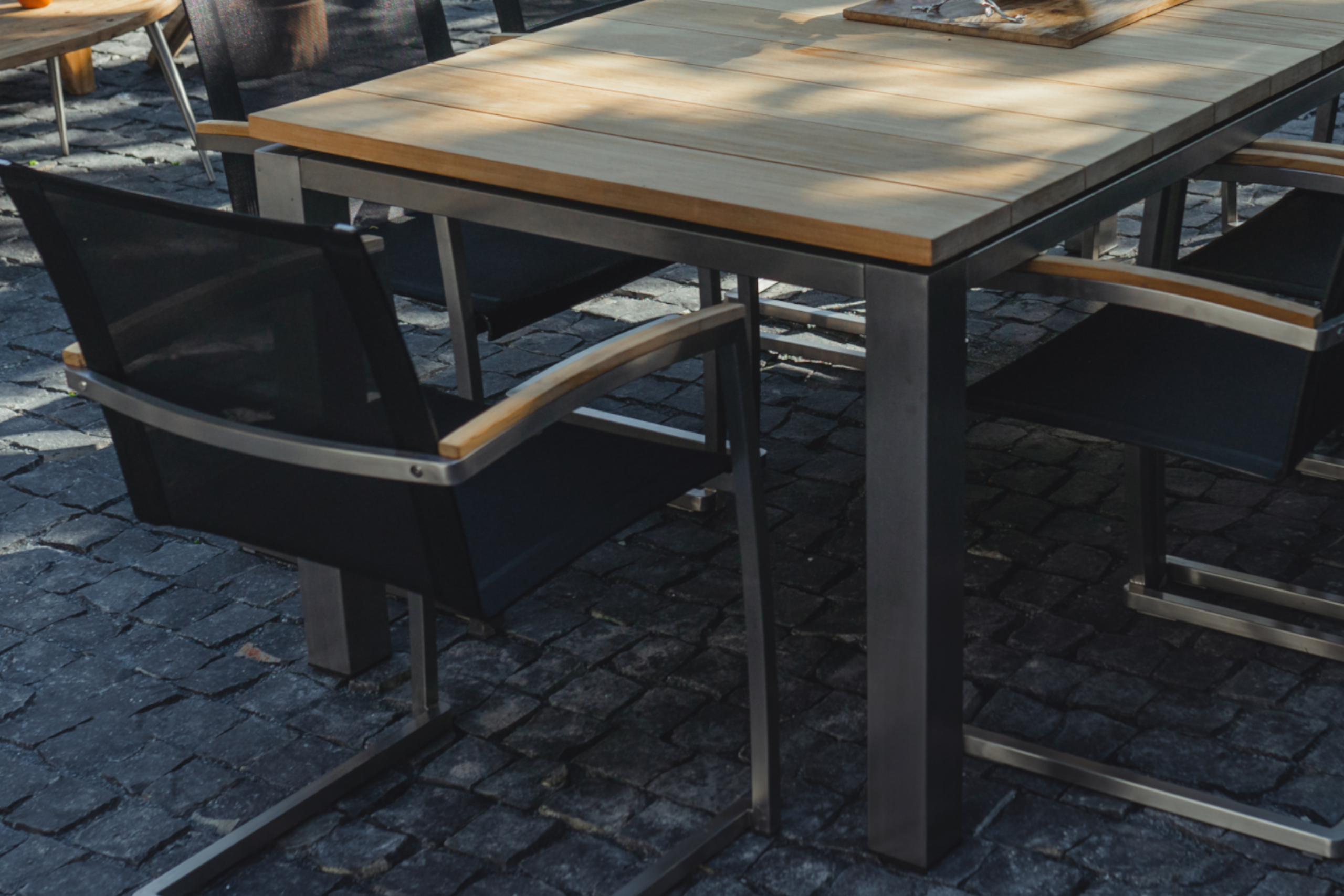Modern çizgiler taşıyan teak masa, stainless steel gövdesiyle, kararlı, güçlü ve zarif.