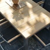 Masaya eşlik eden stainless steel / batyline detaylara sahip teak sandalyeler ile birlikte eşsiz tasarım..